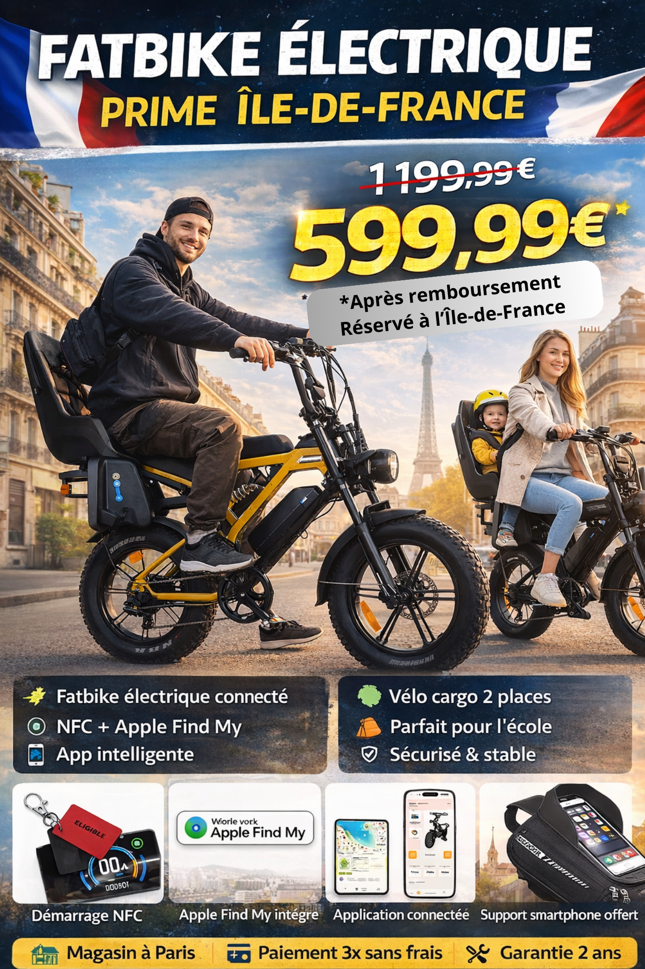 Le Fatbike X80 Pro, classé vélo cargo, est éligible à l’aide officielle de la Région Île-de-France, vous permettant de bénéficier d’un remboursement de 50 % du prix du vélo (dans la limite de 600 €).